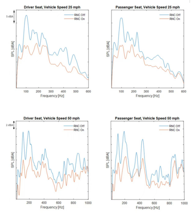 • 在50 mph*(英里/每小时)时,系统控制带宽拓展至 1 kHz,高频峰值降低 5 dB,整体400–1000 Hz频段衰减约 3 dB。