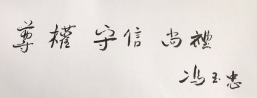 我曾亲眼看到了冯玉忠先生写给于海洋的墨迹:“尊权 守信 尚礼”和“坚持三向精神 向上 向善 向爱”的题字。这是先生的精神遗产,也是对学生于海洋的信任和嘱托。如今,这些信任和嘱托,己经变成了于海洋的实际行动,也在长篇报告文学《雪落长河静无声》书中有了细腻真实的描写。这使我在更深的层次上更进一步地了解了这个当过官做过企业颇有个性的东北老爷们于海洋全景式的人生痕迹,让我看到这个面相文雅的莘莘学子身上所拥有的侠之大气,他明察善恶,敢于亮剑,他做企业时为老百姓的事躬身而为,不惜代价,令人感动的一连串铁骨柔情的故事,那一幅幅令人泪目,并触碰灵魂的真实场景,给我留下一个有担当有智慧有骨气有悲悯之心的优秀民营企业家的真实形象。