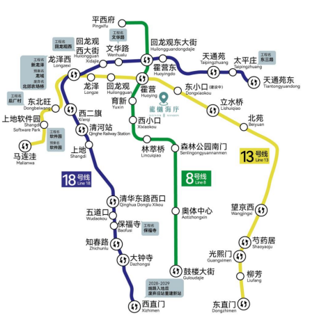 龍樾海序所在的中轴五环,拥有一套非常完整的交通体系,一是依托北五环快速路网,15分钟到上地、25分钟至中关村,也可以通过西侧的京藏高速与东侧的立汤路快速抵达内城商圈;二是依托地铁13号线,实现对西二旗与望京两大产业中心的快速连接,虽然目前仍需在距离项目较远的立水桥站或者霍营站乘车,2028年东小口站通车后,从项目出发步行约1公里,大约10分钟抵达,从而实现3站望京5站西二旗的极速出行,保障日常通勤的高效与便捷。除了地铁站的规划落地,项目周边还可通过现有公交系统快速接驳临近地铁站点,形成“地铁+公交”的立体通勤网络。